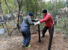 параллельно с этим установив заранее изготовленные памятники и цветники. Затем вернули на место металлическое ограждение и засыпали цветники и площадь перед