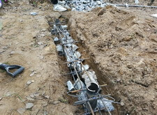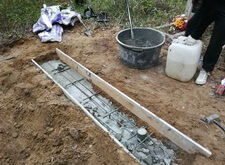 Затем выставляем в траншее опалубку и поэтапно заливаем её бетоном. Получившееся основание выставлено чётко в уровень земли и послужит надёжным гарантом того,