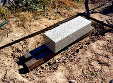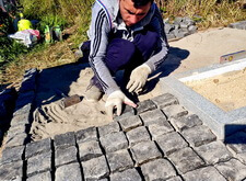 Засыпаем территорию участка пескобетонной смесью и начинаем укладывать брусчатку, одновременно монтируя заранее принесённый памятник.