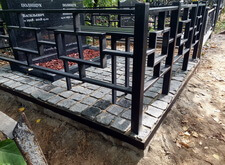 Первым делом мы демонтировали с территории участка кресты и ограждение, параллельно готовя землю к брусчатке. Когда подготовительные работы были завершены мы установили оградке, по низу которой сделали периметр из опалубки для последующей заливки бетоном.