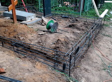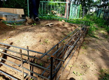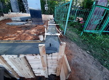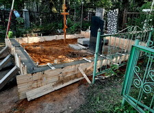 Вкопанные ранее сваи послужили великолепной основой для металлического каркаса, который мы и сварили прямо на территории места захоронения. Каркас был установлен по периметру участка с целью придать дополнительную жёсткость опалубке.