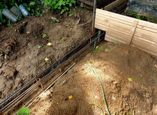 Затем мы приступили к подготовительному этапу установки ограды. Конструкция была объёмной, а потому было необходимо сначала сделать надёжный бетонный каркас. Мы выкопали траншею, а затем там, где это было необходимо, заколотили металлические сваи.