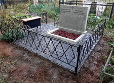 Следующим этапом в работе с могилой стала установка нового памятника, выполненного из светлого гранита и рассчитанного на двух покойных. Плиту доставили на кладбище практически сразу после изготовления, так что надпись пришлось делать уже по месту. Впрочем, на качестве работы это не коим образом не отразилось.