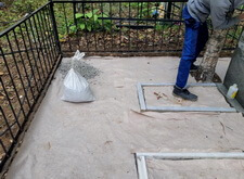 Когда подготовительный этап был завершён, мы засыпали крошку. Окончательный вариант представлен на приведённых ниже фотографиях. Место захоронения смотрится опрятно и красиво, однако осенью, когда начнёт опадать листва, весь мусор осядет на крошке и вычистить его будет практически невозможно.