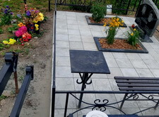 Подготовленную почву застелили геотекстилем, который будет препятствовать проростанию сорной травы в плиточных швах. В это же время на территории могилы были дополнительно установлены лавочка и столик.