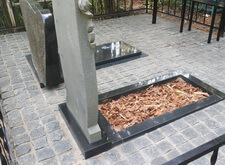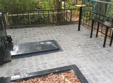 Переходим к завершающему этапу работы. Переустанавливаем уже стоящий памятник, немного его приподнимая, и закладываем территорию участка гранитной брусчаткой.