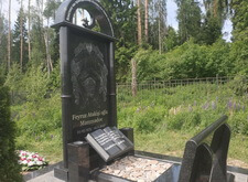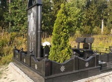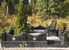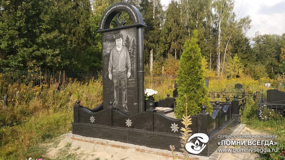 Собираем лавочку, устанавливаем её напротив надгробья. Цветник у подножья мемориальной стелы наполняем светлыми камнями. Под полукруглую арку памятника укрепляем вырезанную из гранита фигуру полумесяца.