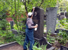 Практически сразу мы взялись за восстановление надписи: для этого её следовало покрыть специальным раствором. Перед тем, как приступить к надгробью, мы тщательно убрали на могиле: пропололи растущие у основания памятника цветы, а также убрали с территории участка весь мусор, который в последствие был вывезен с кладбища.
